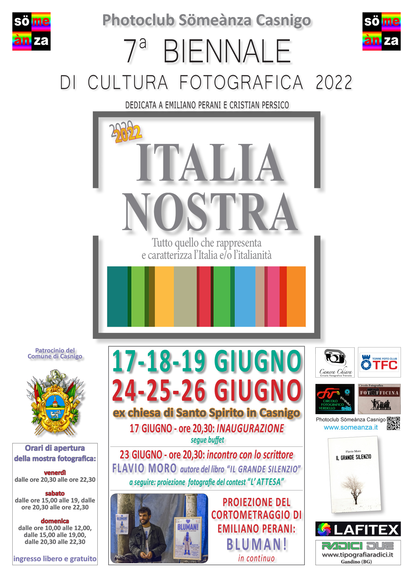 Viene inaugurata venerdì 17 giugno alle 20.30 a Casnigo la settima edizione della Biennale di Cultura fotografica promossa dal Photoclub Sömeànza. Sotto il titolo “Italia Nostra - tutto quello che rappresenta e caratterizza l’Italia e/o l’italianità” viene allestita una mostra d’immagini patrocinata dal Comune di Casnigo, nella ex chiesa di Santo Spirito. La Biennale è un appuntamento consolidato del Club della Val Gandino, che ha visto crescere negli anni passione, attaccamento al territorio ed una complessiva cifra artistica dei diversi fotografi.