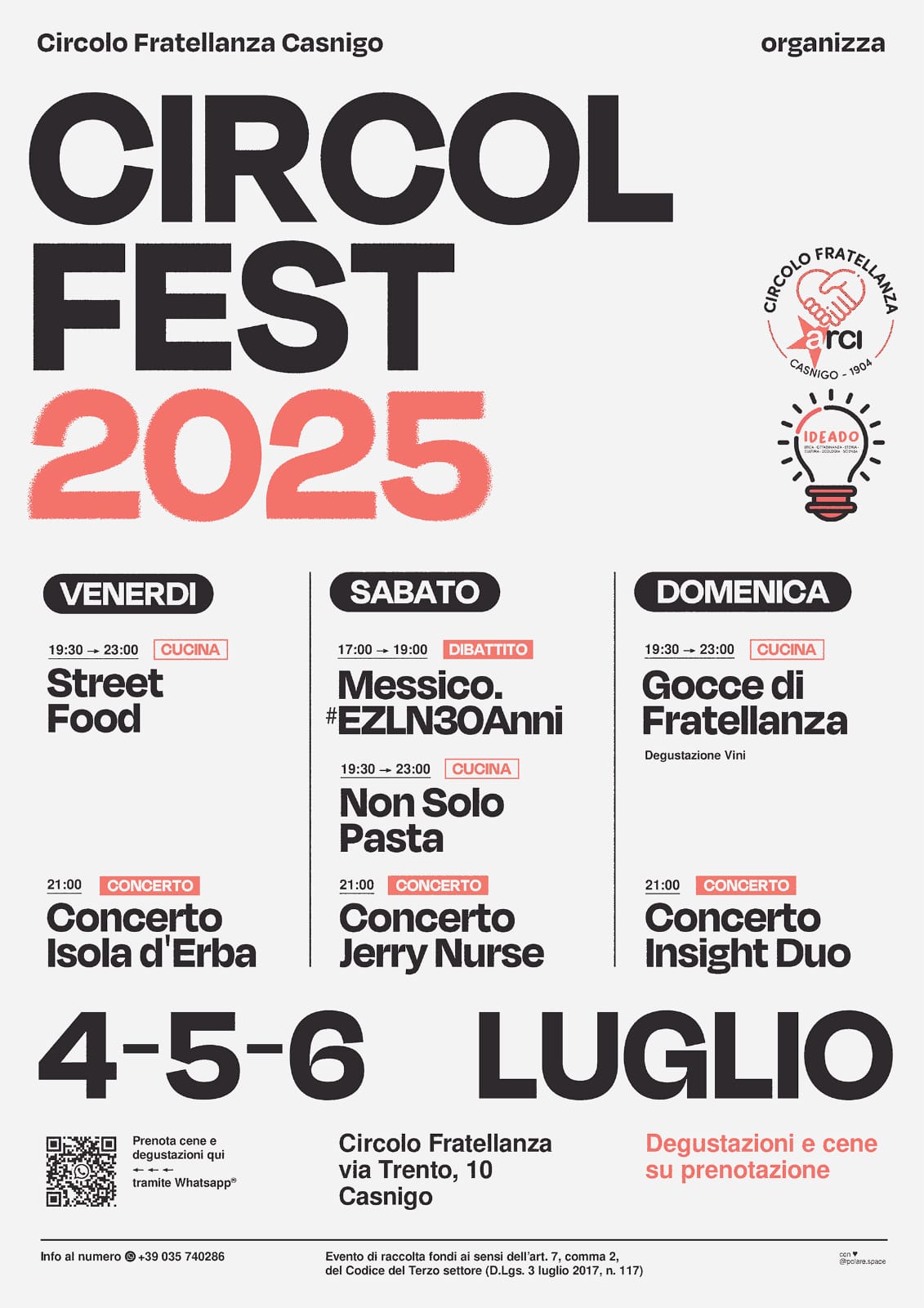 Il Circolo Fratellanza di Casnigo organizza dal 4 al 6 luglio il Circol Fest, un evento aperto alla comunitร con concerti, dibattiti, degustazioni e cene su prenotazione.