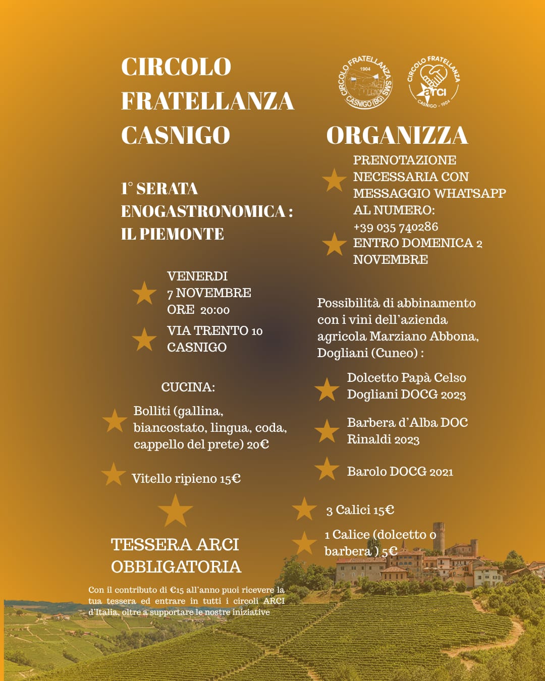 Il Circolo Fratellanza di Casnigo organizza una serata speciale dedicata alla scoperta delle eccellenze gastronomiche del Piemonte.