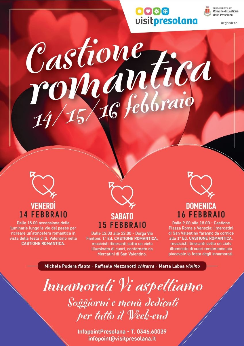 Sabato 15 febbraio, dalle 12.00, comincia ufficialmente la I edizione di "Castione romantica": il cielo si illumina di cuori, le vie si animano con i Mercatini di San Valentino e musicisti itineranti creeranno l'atmosfera perfetta per la festa.