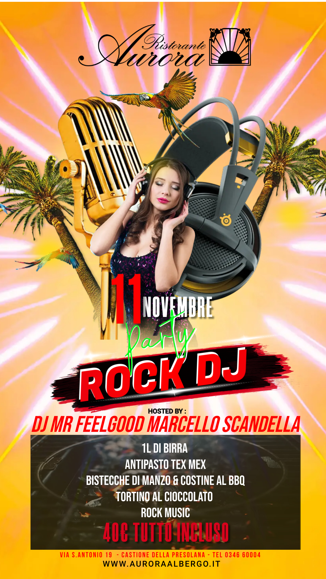 Lโ Albergo Ristorante Aurora organizza la serata Rock Dj con Dj Mr Feelgood Marcello Scandella. Sabato 11 novembre รจ in programma una cena con antipasto Tex Mex, bistecche di manzo e costine al BBQ, torino al cioccolato e un litro di birra. Il tutto accompagnato da rock and roll music.