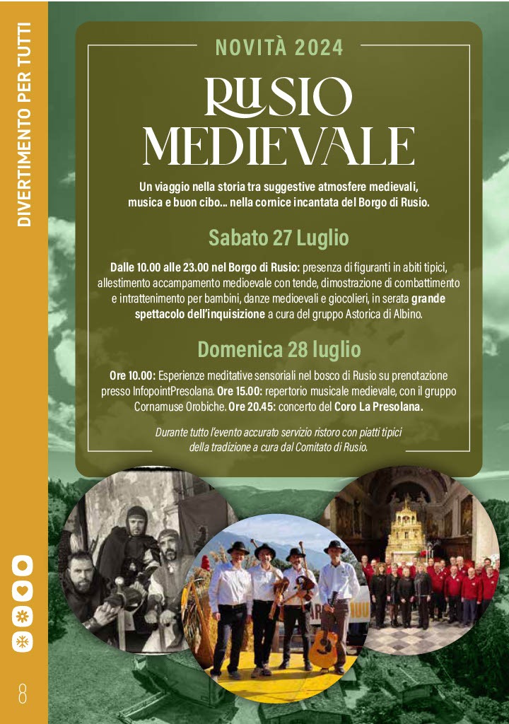 Domenica saranno presenti espositori a tema ed esperienze meditative nel bosco. Dalle 15.00 suonerร il gruppo Cornamuse Orobiche con repertorio musicale medievale mentre in serata si esibirร il Coro La Presolana.