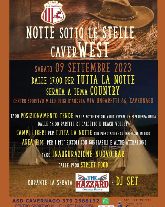 Una serata a tema country in cui Cavernago si trasforma in Caverwest, dove saranno presenti molteplici attivitร per chi vuole vivere un'esperienza unica.