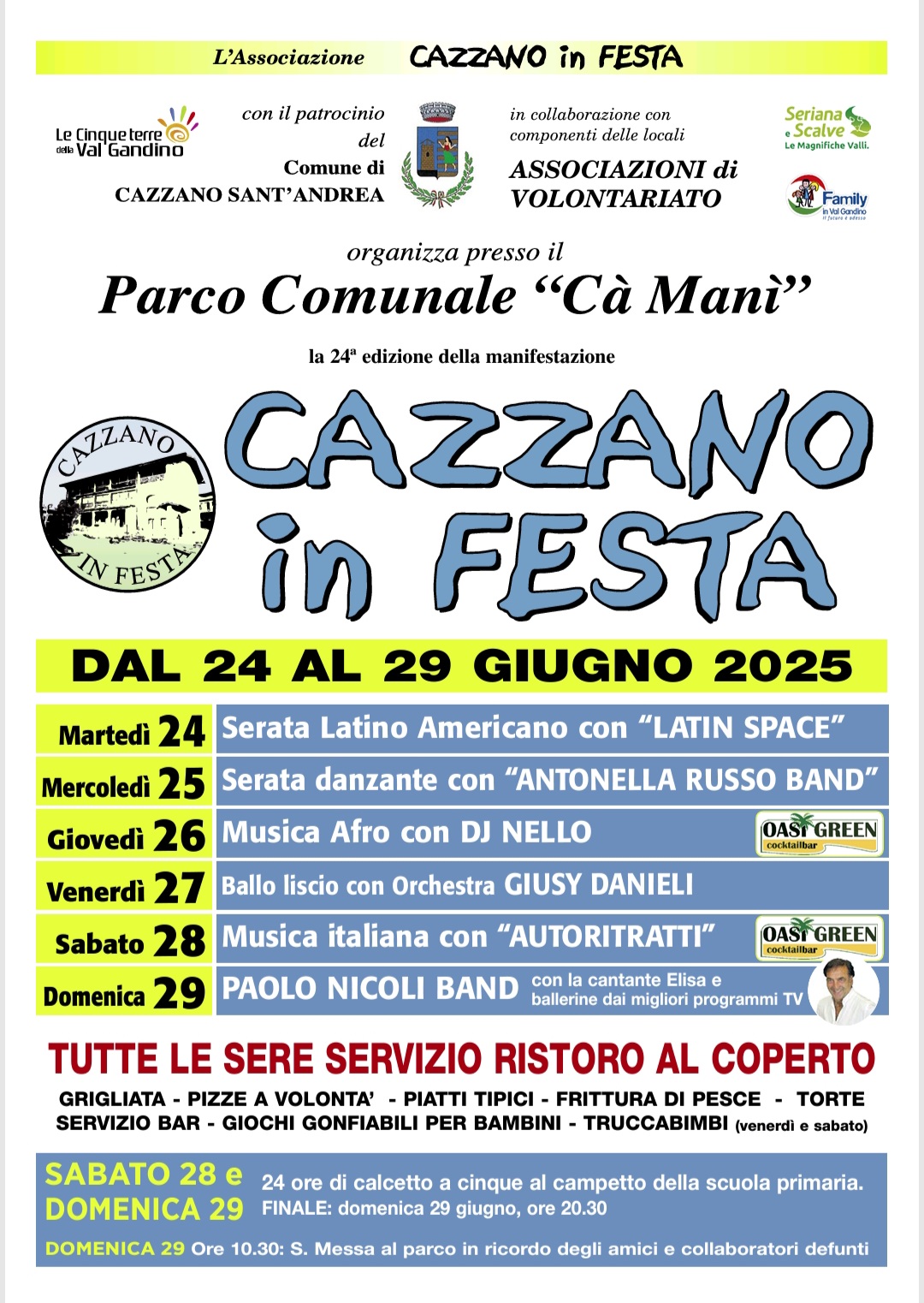 Cazzano è di nuovo in Festa: dal 24 al 29 giugno musica e cucina al Parco Cà Manì. La manifestazione ricreativa giunge alla 24esima edizione, gode del patrocinio del Comune.