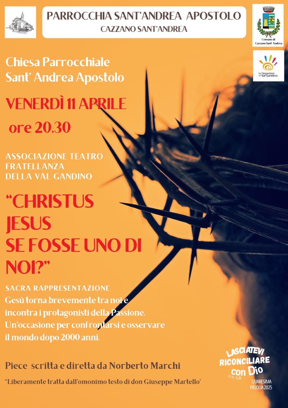 In occasione delle celebrazioni pasquali l’11 aprile, alle 20,30 presso la chiesa Parrocchiale di Cazzano Sant’Andrea, si terrà una rappresentazione sacra dal titolo “Christus Jesus e se fosse uno di noi?”, una piece scritta e diretta da Norberto Marchi.