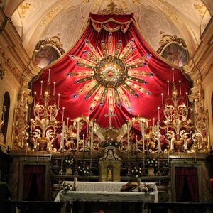 In chiesa viene montato il grandioso apparato della Raggiera, che domina la navata centrale. La struttura lignea, particolarmente suggestiva, è l’allegorica espressione del tema della morte nella prospettiva della Chiesa trionfante. Ciascun elemento ha un preciso significato dottrinale e liturgico.