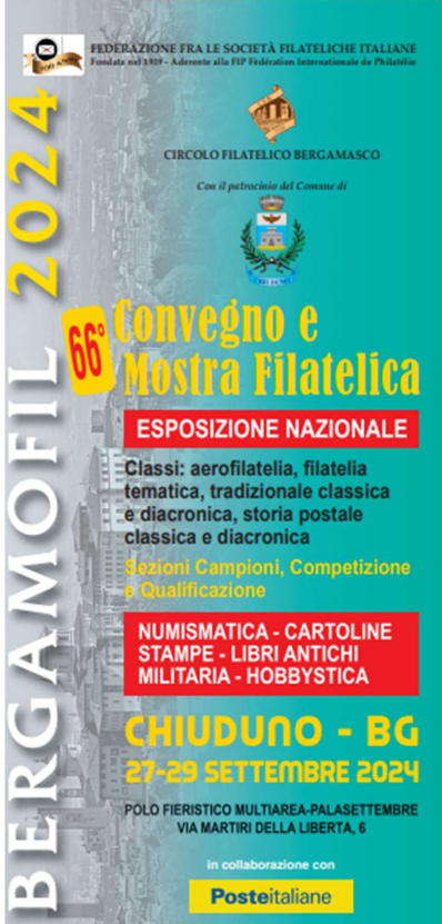 Tra il 27 ed il 29 settembre Chiuduno sarà al centro del mondo filatelico con la 66^ Mostra Filatelica ed Esposizione Nazionale a concorso “BergamoFil24”. La kermesse è organizzata dall’ultracentenario Circolo Filatelico Bergamasco che anche quest’anno potrà contare sulla partecipazione di numerosi espositori. Come ormai da tradizione, l’evento si terrà presso il Polo Fieristico Multiarea “Palasettembre”.