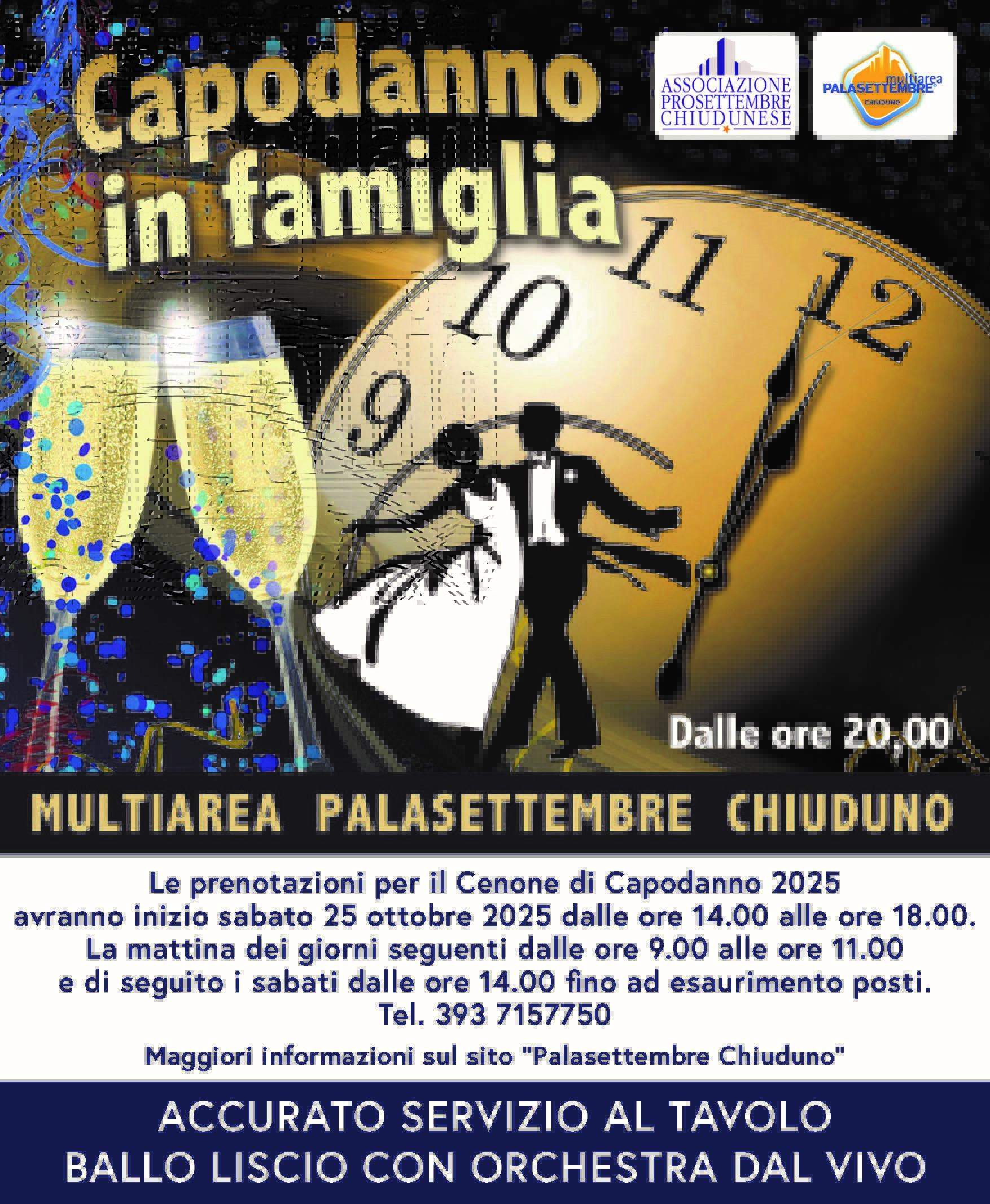 Festeggiate l’arrivo del nuovo anno al Palasettembre! Un evento pensato per tutta la famiglia, con servizio al tavolo, orchestra dal vivo e brindisi di mezzanotte.