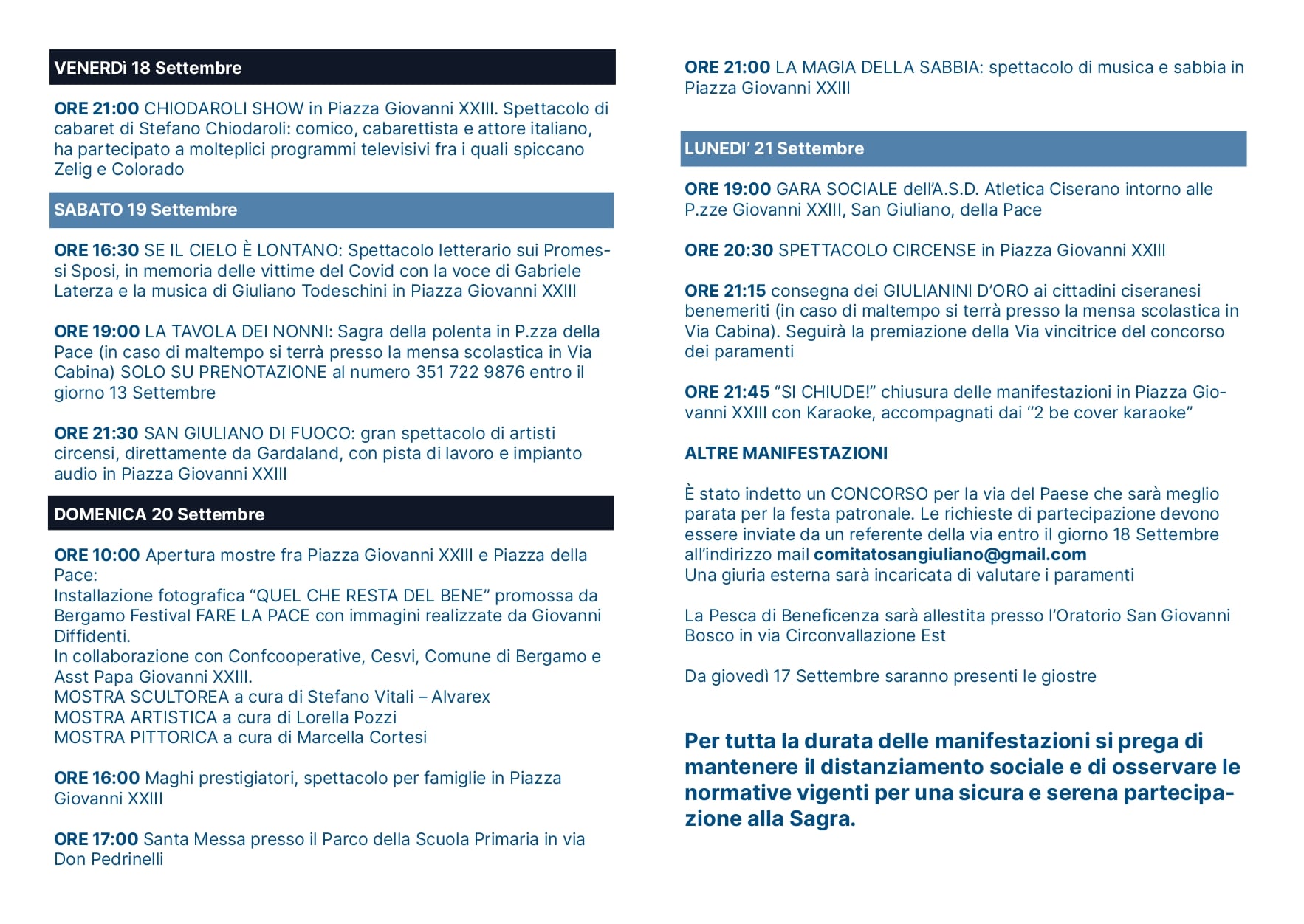 La giornata di festa termina alle 21.00, con lo spettacolo "La magia della sabbia" (piazza Giovanni XXIII).