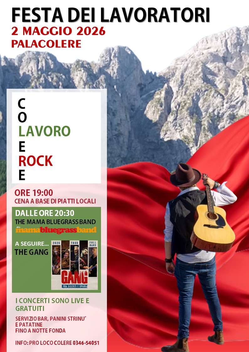 Sabato 2 maggio appuntamento al PalaColere per festeggiare la Festa dei Lavoratori. Dopo la cena tipica, sul palco saliranno i The Mama Bluegrass Band e i The Gang.