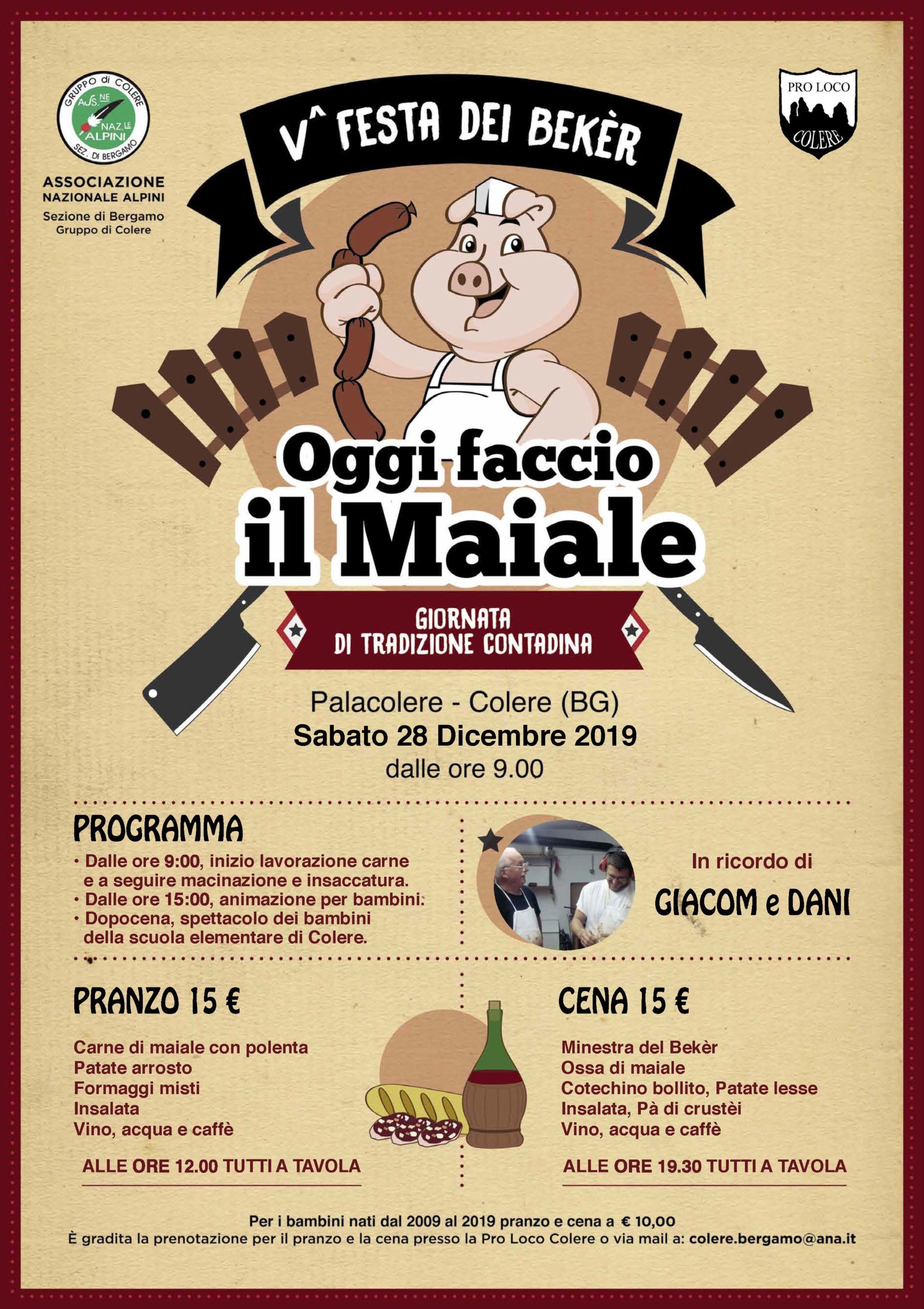 Dalle ore 15.00 per i più piccoli un pomeriggio ricco di sorprese: laboratorio “crea il tuo maialino”, breve merenda, giochi e cena in compagnia in attesa dello spettacolo dei bambini della scuola elementare di Colere.