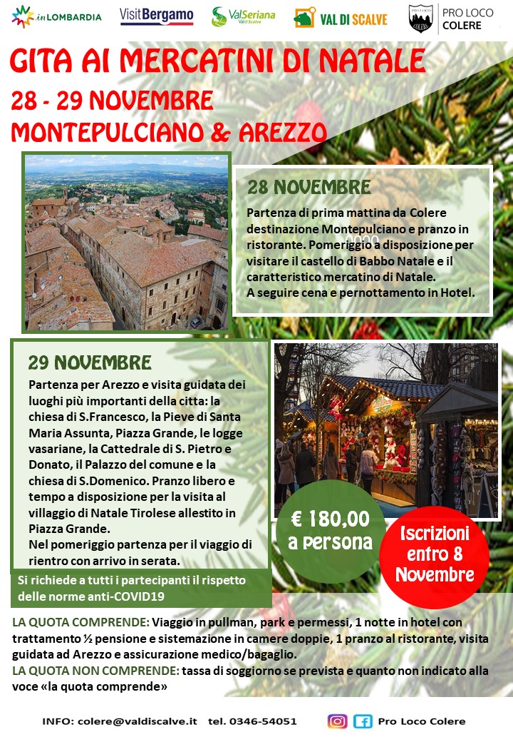 Sabato 28 Novembre si parte in mattinata da Colere alla volta di Montepulciano, dove visiterete il castello di Babbo Natale e il caratteristico mercatino a Montepulciano.