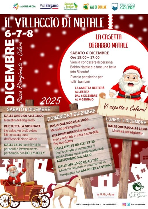 Il villaggio di Natale vi aspetta per scoprire i nostri piccoli ma caratteristici mercatini di Natale a Colere, un piccolo angolo di Paradiso ai Piedi della Presolana, tre giorni di festa, musica, profumi e divertimento per grandi e piccini! Il Villaggio di Natale vi aspetta in Piazza Risorgimento da sabato 6 a lunedì 8 dicembre, dalle 9 alle 18.