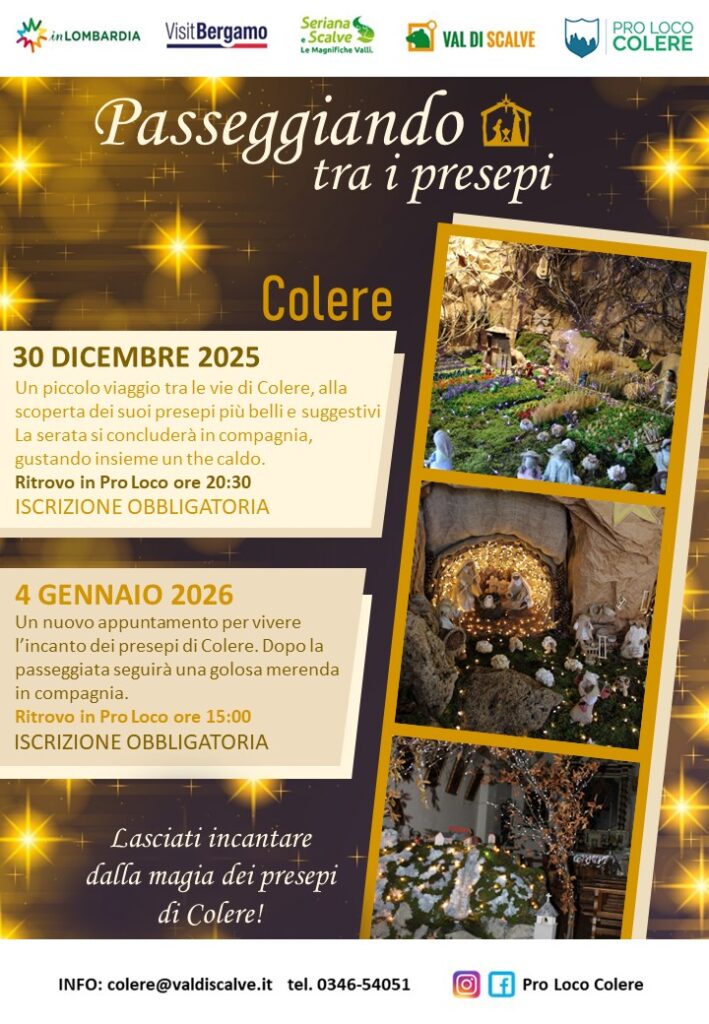 La Pro Loco Colere organizza due passeggiate imperdibili alla scoperta dei presepi più affascinanti del paese, con iscrizione obbligatoria per entrambi gli eventi e ritrovo presso la sede della Pro Loco Colere.