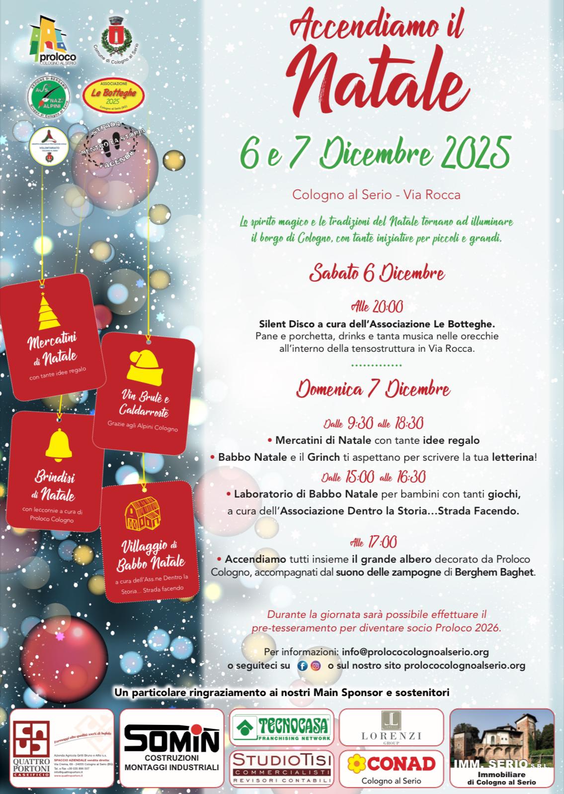 Cologno al Serio si prepara ad accendere ufficialmente l’atmosfera natalizia con la manifestazione «Accendiamo il Natale», in programma sabato 6 e domenica 7 dicembre in Via Rocca. L’iniziativa, promossa dalla Pro Loco di Cologno al Serio con il sostegno delle associazioni del territorio, offrirà due giornate ricche di eventi, musica, mercatini e intrattenimento per tutte le età.