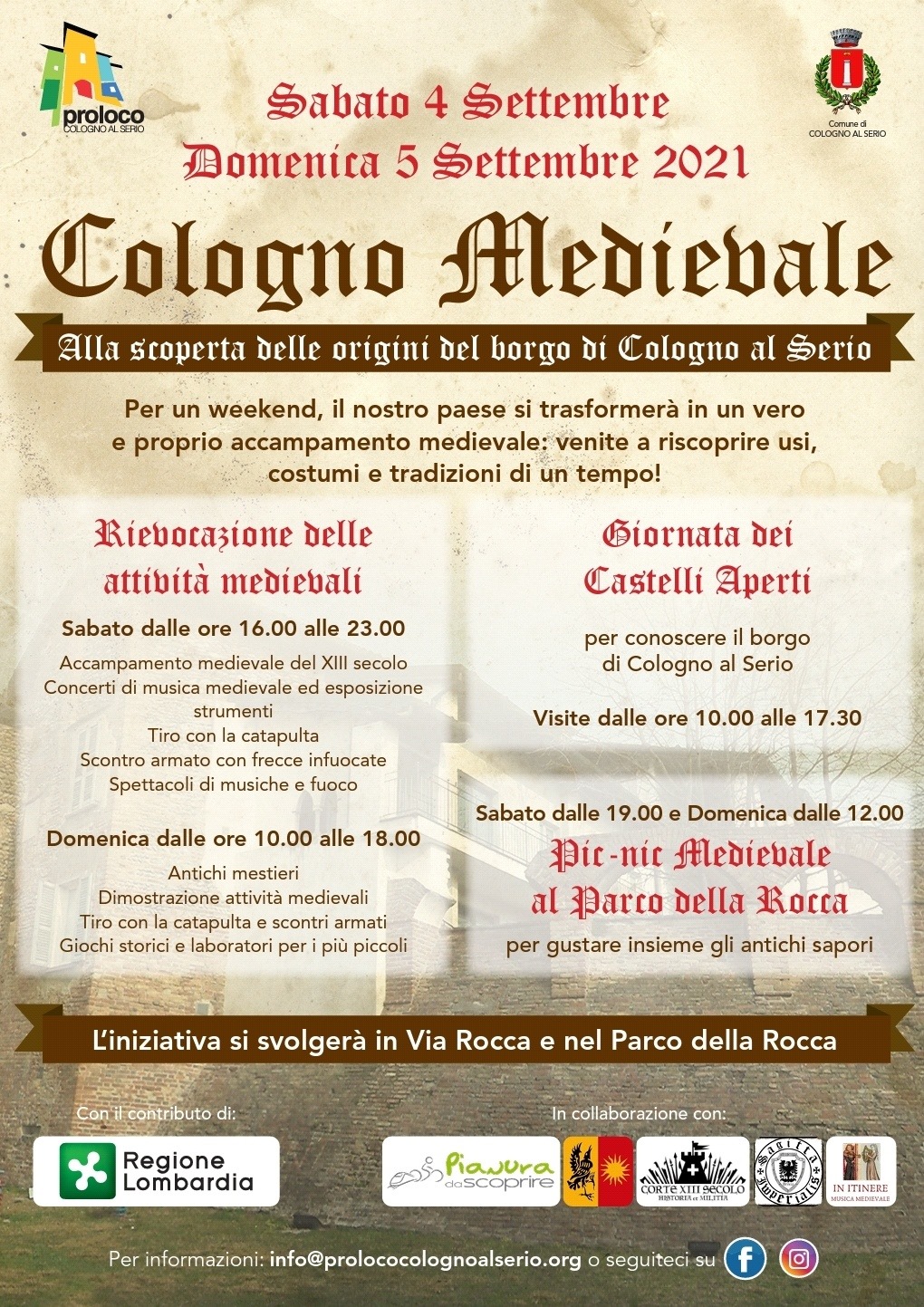 Sabato 4 e domenica 5 settembre sarà un weekend interamente dedicato alla riscoperta di tradizioni, usi e costumi dell’epoca. Combattimenti armati, spettacoli di arceria e di fuoco, musica e strumenti antichi, accampamento e cucina medievali. Il tutto arricchito dalle visite guidate al fantastico borgo di Cologno e dal pic-nic medievale.