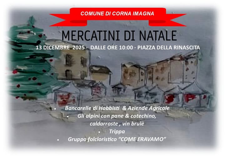 Il Comune di Corna Imagna ospiterà i tradizionali Mercatini di Natale il giorno 13 dicembre. Sarà l'occasione per visitare le bancarelle di hobbisti e aziende agricole e per gustare le specialità gastronomiche locali.