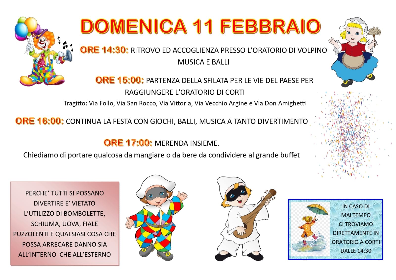 In caso di maltempo, ritrovo direttamente presso lโOratorio di Corti dalle ore 14:30.