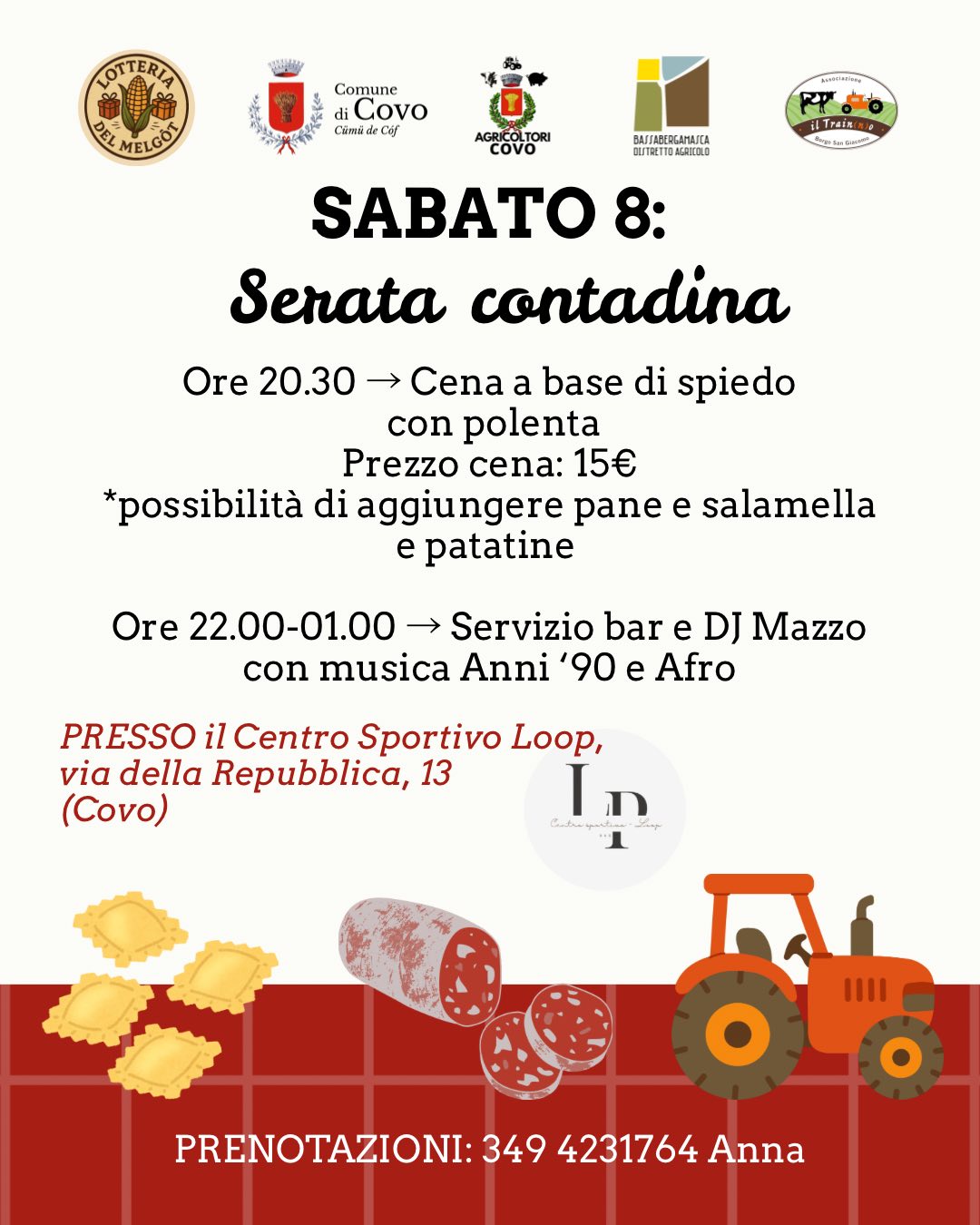 Alle 20.30, cena a base di spiedo e polenta (prenotazione: 349.4231764). A seguire, fino all'1 di notte, servizio bar e musica anni'90 e afro con DJ Mazzo.