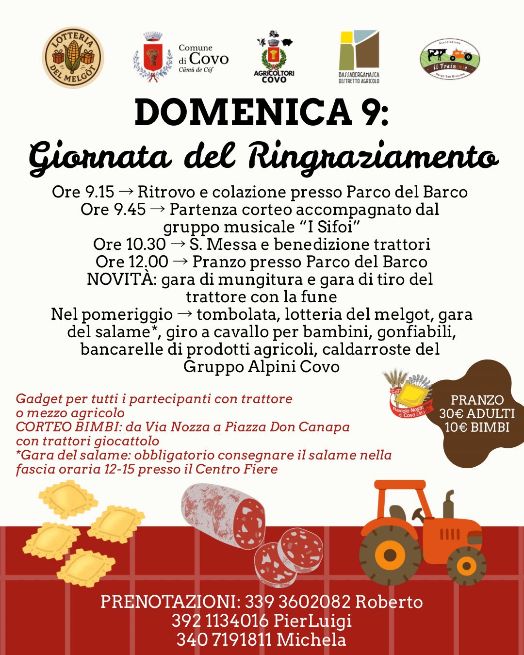 Nel pomeriggio: tombolata, lotteria del melgot, gara del salame, giro a cavallo per bambini, gonfiabili, bancarelle di prodotti agricoli e caldarroste del Gruppo Alpini Covo.