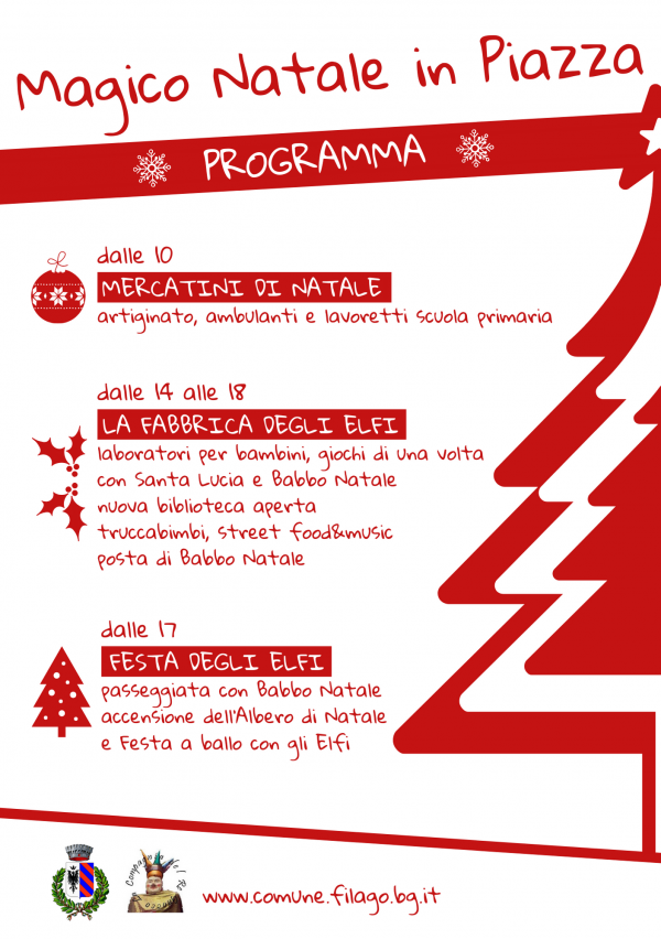 A Filago, nell’Isola bergamasca, continua la tradizionale manifestazione di fine novembre «Magico Natale in Piazza». Domenica 24 novembre strade chiuse in centro paese per far spazio alle bancarelle degli artigiani e degli hobbisti, mentre i giardini comunali diventano il regno degli Elfi del «Villaggio Natalizio e gli Elfi Ballerini», a cura de La Compagnia del Re Gnocco.