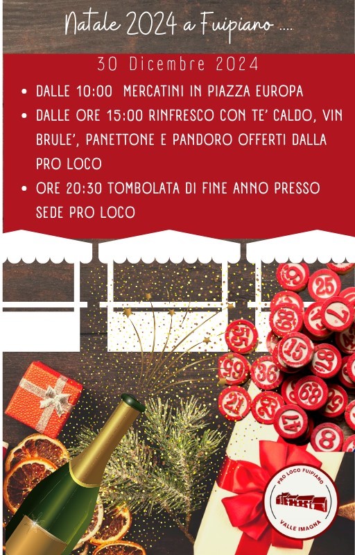 La rassegna "Estate insieme a Fuipiano 2024" è quasi conclusa, tra gli ultimi appuntamenti mercatini in piazza, panettone e pandoro, tè caldo e vin brulé per tutti, offerto dalla proloco.