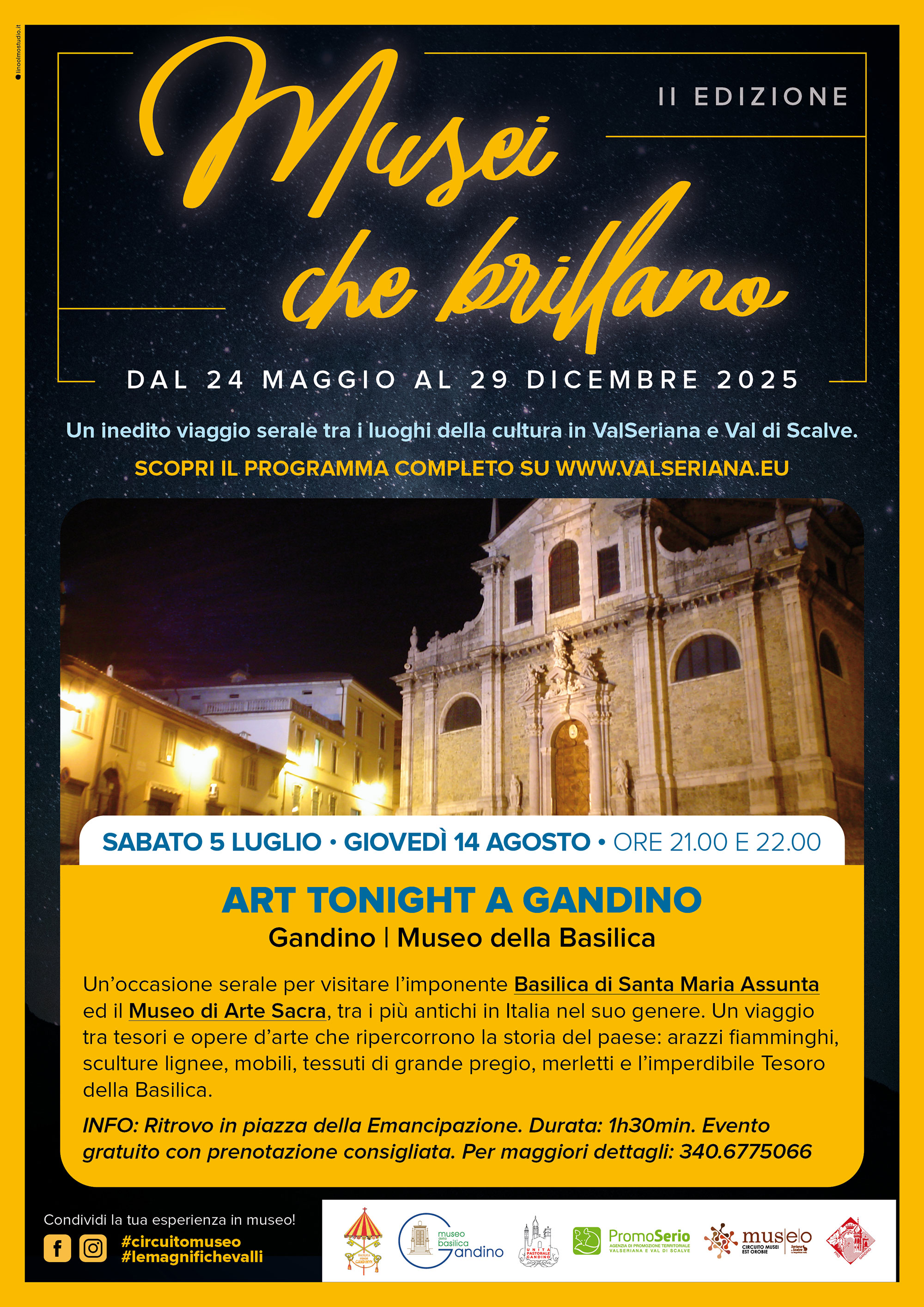 Sabato 5 luglio torna a Gandino lโappuntamento con Art Tonight, nellโambito della rassegna โMusei che brillanoโ. Unโoccasione serale per visitare lโimponente Basilica di Santa Maria Assunta e il Museo di Arte Sacra, tra i piรน antichi dโItalia nel suo genere.