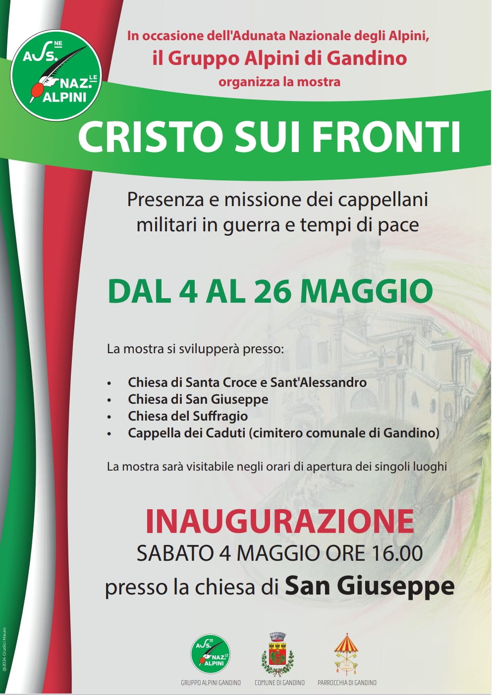 Viene inaugurata sabato 4 maggio alle 16 presso la chiesa di San Giuseppe a Gandino la mostra documentale “Cristo sui Fronti”, patrocinata da Comune e Parrocchia, organizzata dal Gruppo Alpini Gandino in coincidenza con l’Adunata Nazionale di Vicenza e con l’anniversario del 24 maggio 1915, quando l’Italia entrò nel primo conflitto mondiale.