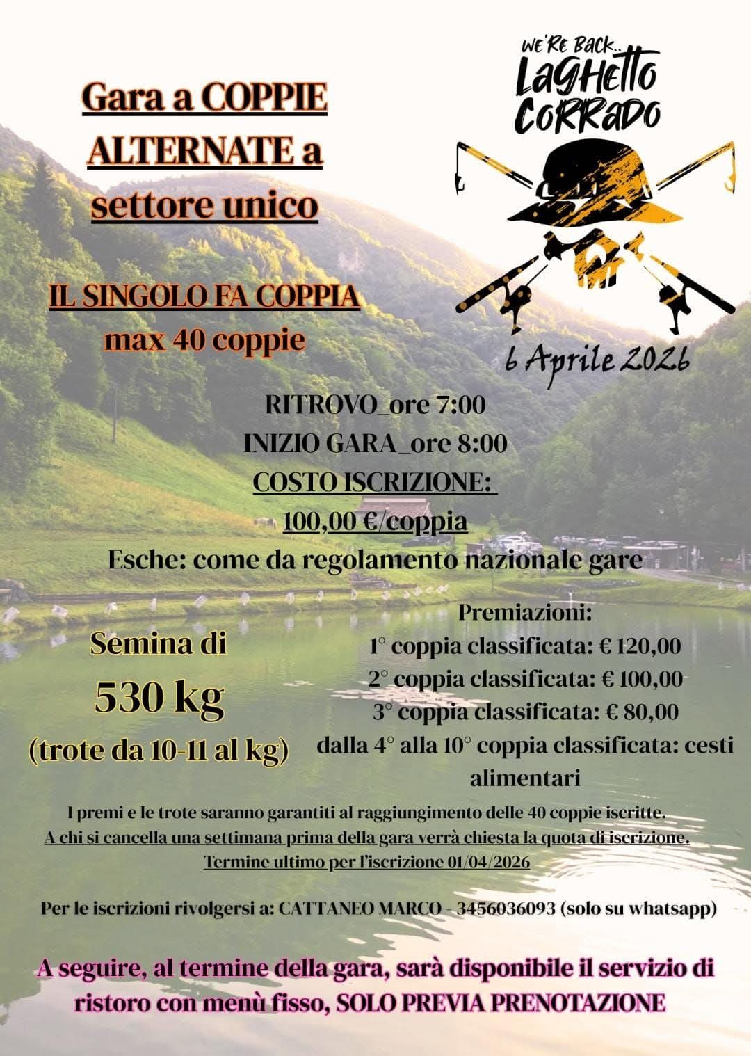 Torna lโappuntamento al Laghetto Corrado con la gara a coppie alternate a settore unico: il singolo fa coppia.