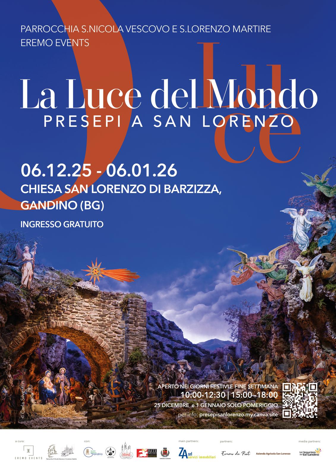 La Eremo Events, in collaborazione con la Parrocchia di San Nicola Vescovo e San Lorenzo Martire, è lieta di presentarvi la mostra “La Luce del Mondo - Presepi a San Lorenzo“, che si terrà presso la chiesa di San Lorenzo di Gandino. Questa iniziativa mira a promuovere l'arte Presepiale, nel suo essere simbolo di arte, cultura e fede. La mostra offrirà un’esperienza unica e coinvolgente, trasportando i visitatori nel cuore della Natività attraverso un percorso espositivo inserito in un luogo altamente suggestivo come la chiesa di San Lorenzo. Verranno esposte 16 opere uniche, progettate e realizzate da grandi presepisti italiani che si sono distinti a livello nazionale e internazionale. Per l’occasione verrà realizzato un piccola pubblicazione sulla Storia del Presepio che sarà omaggiata a tutti i visitatori.