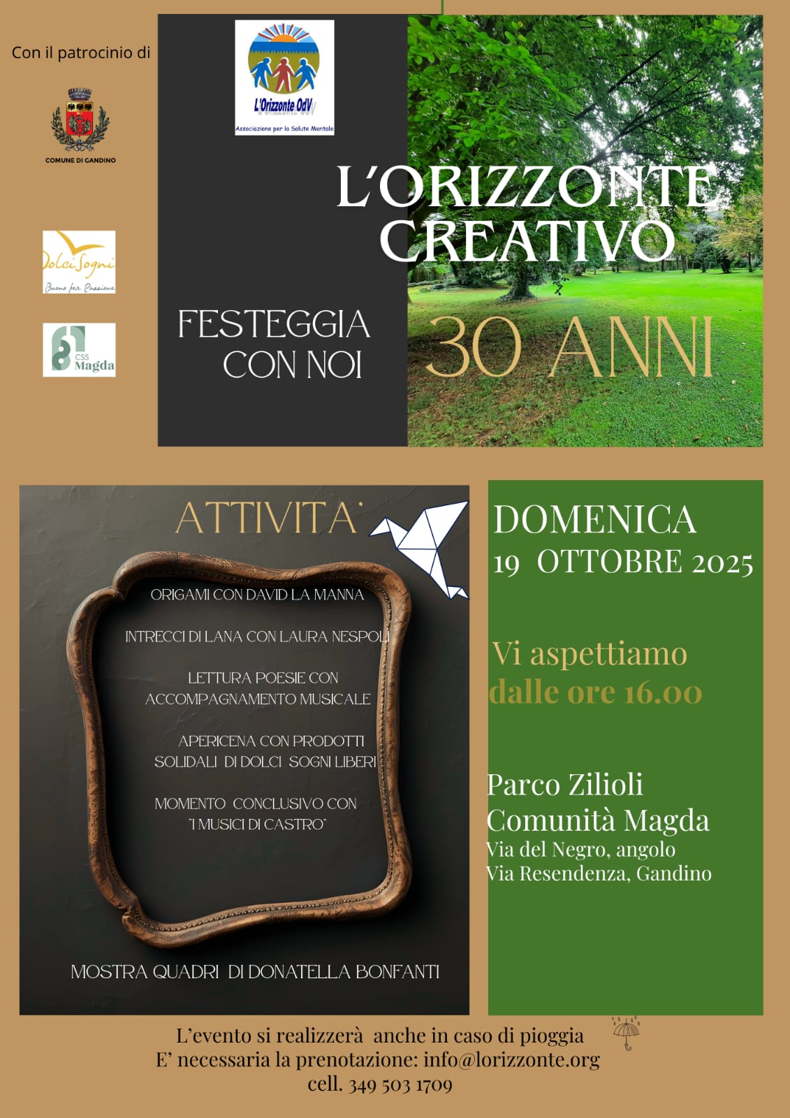 Domenica 19 ottobre 2025, dalle 16, al Parco Zilioli – Comunità Magda un appuntamento per celebrare insieme i 30 anni di L’Orizzonte ODV, associazione per la salute mentale.
