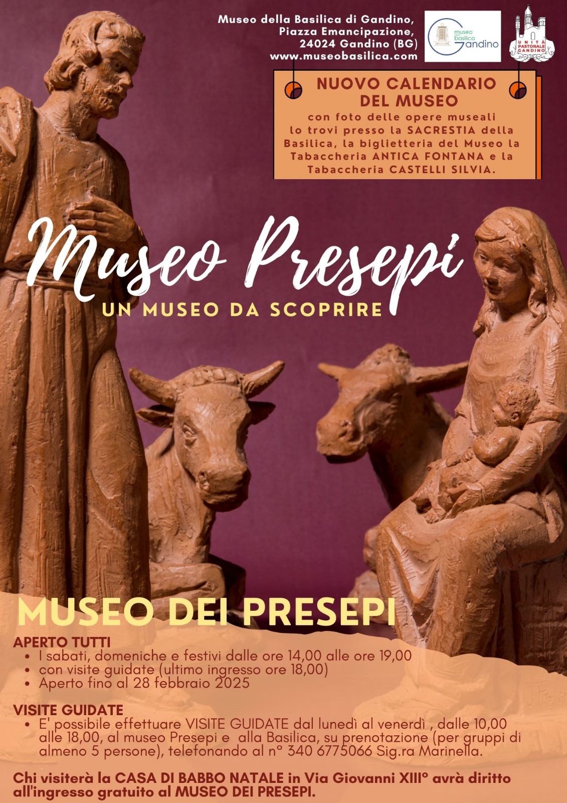 Il Museo dei Presepi di Gandino (a pochi passi dalla Basilica) sarà aperto fino al 28 febbraio 2025, tutti i sabati, domeniche e festivi dalle 14 alle 19, con visite guidate (ultimo ingresso alle 18).
