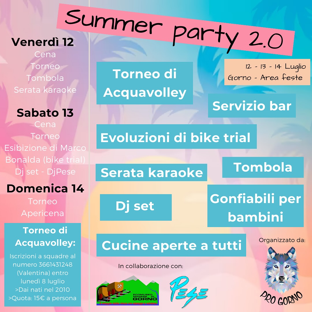 La Pro Gorno organizza, da venerdì 12 a domenica 14 luglio, il Summer Party 2.0, tre giornate dedicate allo sport e al divertimento.
