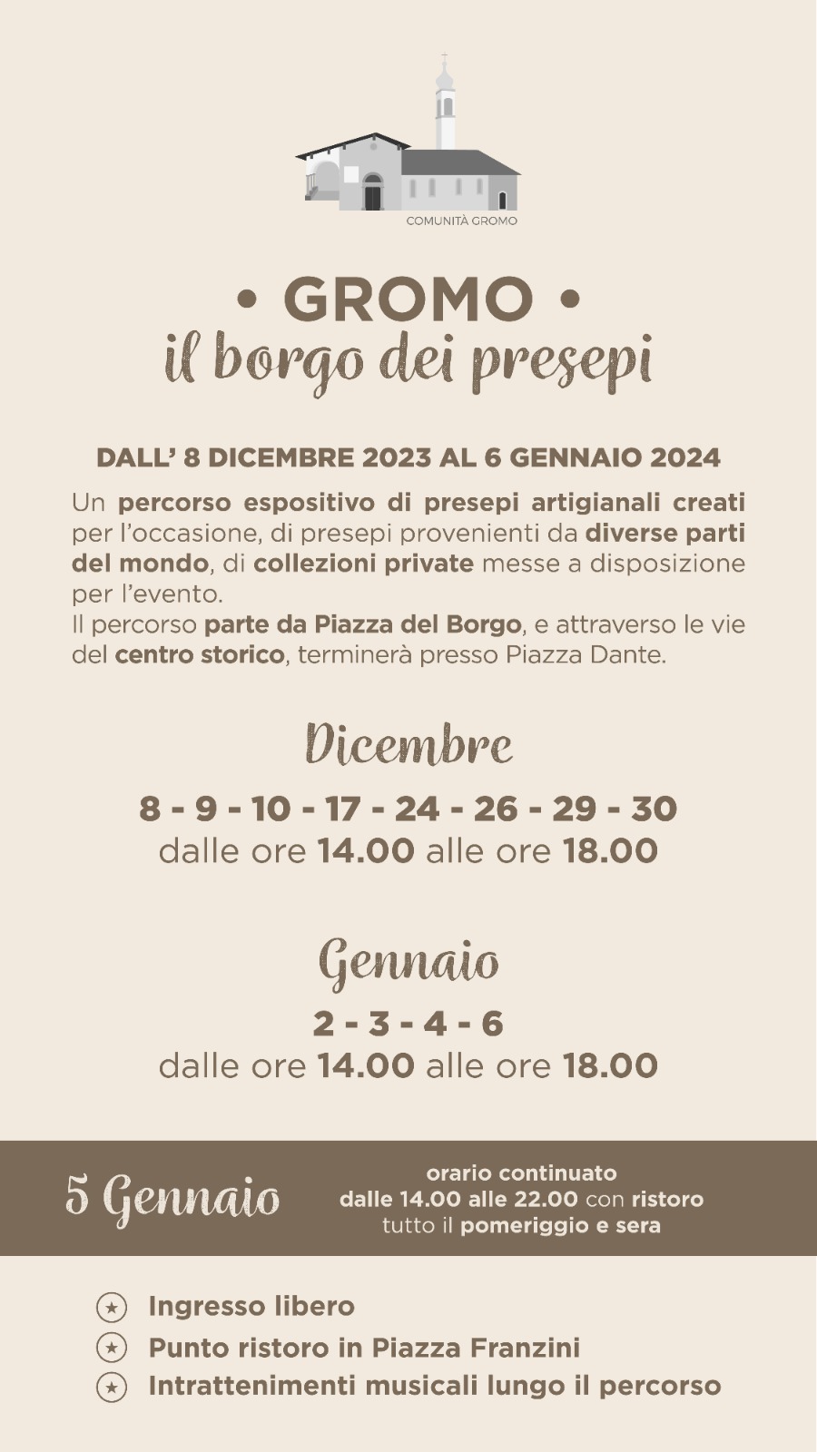 Da venerdì 8 dicembre fino a sabato 6 gennaio, il Comune di Gromo organizza un percorso espositivo di presepi artigianali creati per l'occasione, presepi provenienti da diverse parti del mondo, presepi di collezioni private messi a disposizione per l'evento.