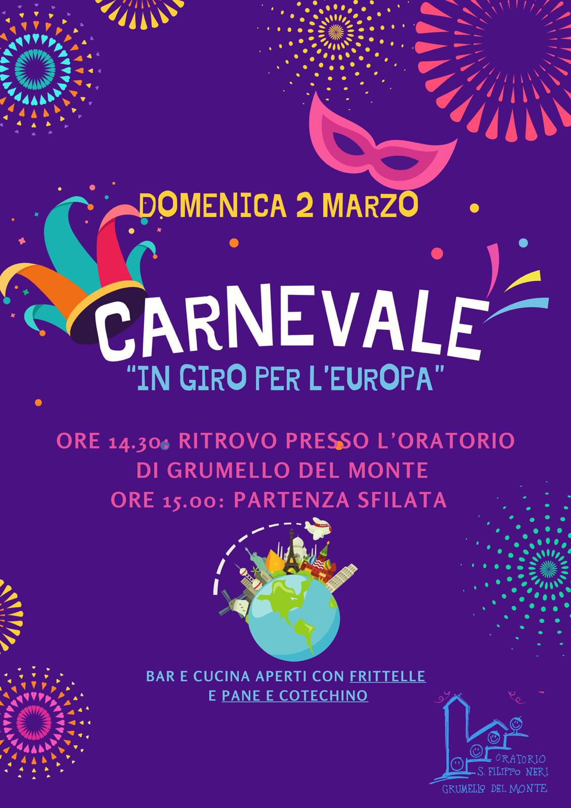 Domenica 2 marzo l'Oratorio di S. Filippo Neri di Grumello del Monte invita tutta la comunità a festeggiare insieme il Carnevale con un tema speciale: "In Giro per l’Europa". Un viaggio immaginario attraverso i colori e le tradizioni del continente europeo, che promette di portare divertimento, allegria e tanto spirito di festa! Il programma della giornata prevede il ritrovo alle ore 14:30 presso l'Oratorio di Grumello del Monte, con la partenza della sfilata di Carnevale alle ore 15:00. La sfilata, aperta a tutti, sarà un'occasione per ammirare i costumi più creativi e originali, ispirati alle varie culture e tradizioni europee.