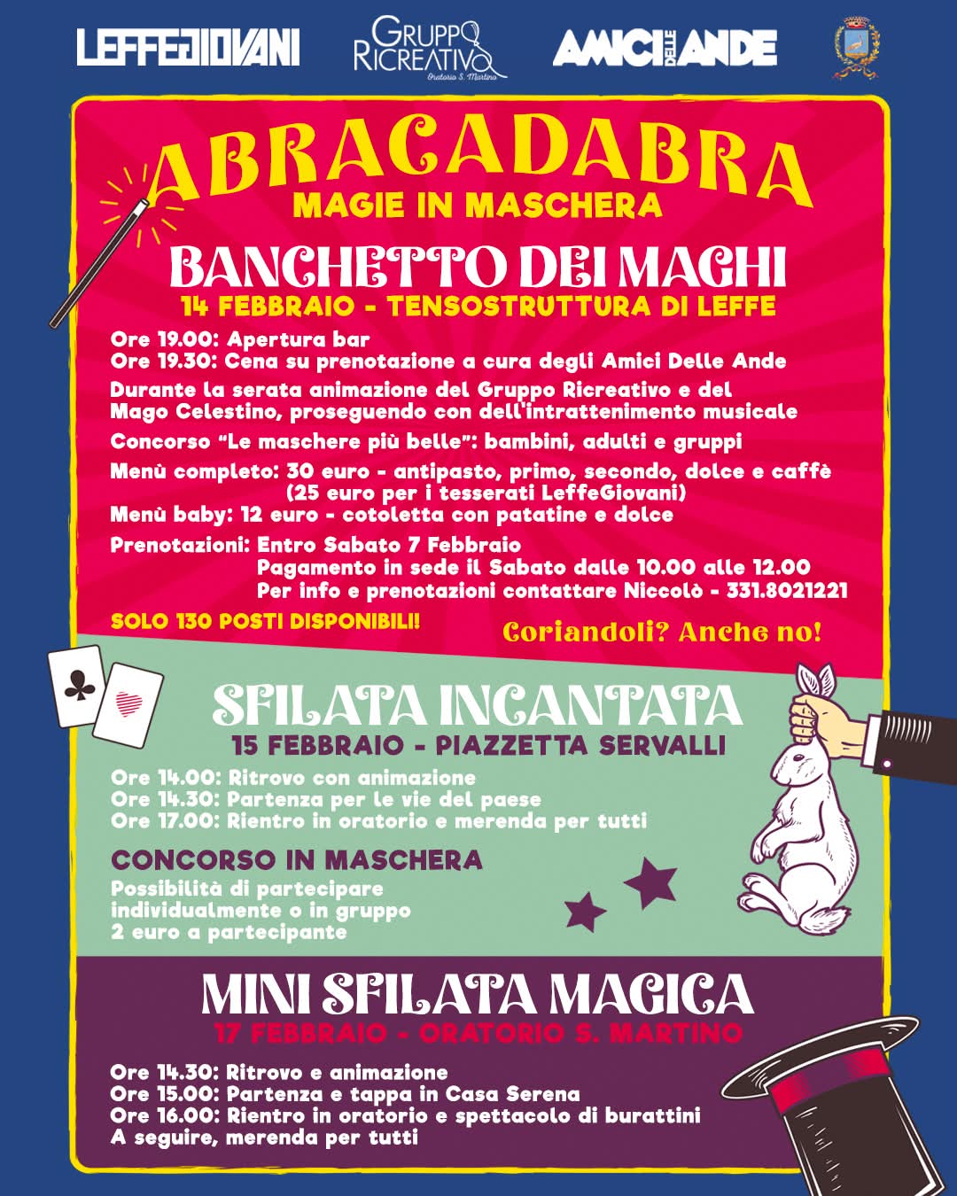 Leffe si prepara a vivere un Carnevale ricco di appuntamenti dedicati a bambini, famiglie e gruppi, tra animazione, musica e magia. Si comincia sabato 14 febbraio con il Banchetto dei Maghi in tensostruttura: apertura bar alle 19.00 e cena su prenotazione alle 19.30. La serata sarà animata dal Gruppo Ricreativo e dal Mago Celestino, con intrattenimento musicale e il concorso “Le maschere più belle” aperto a bambini, adulti e gruppi.