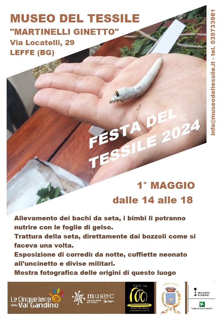 Mercoledì 1 Maggio, Festa del Tessile presso il Museo del Tessile a Leffe, dove i visitatori potranno vedere i bachi da seta vivi e i bambini potranno nutrirli con le foglie di gelso.