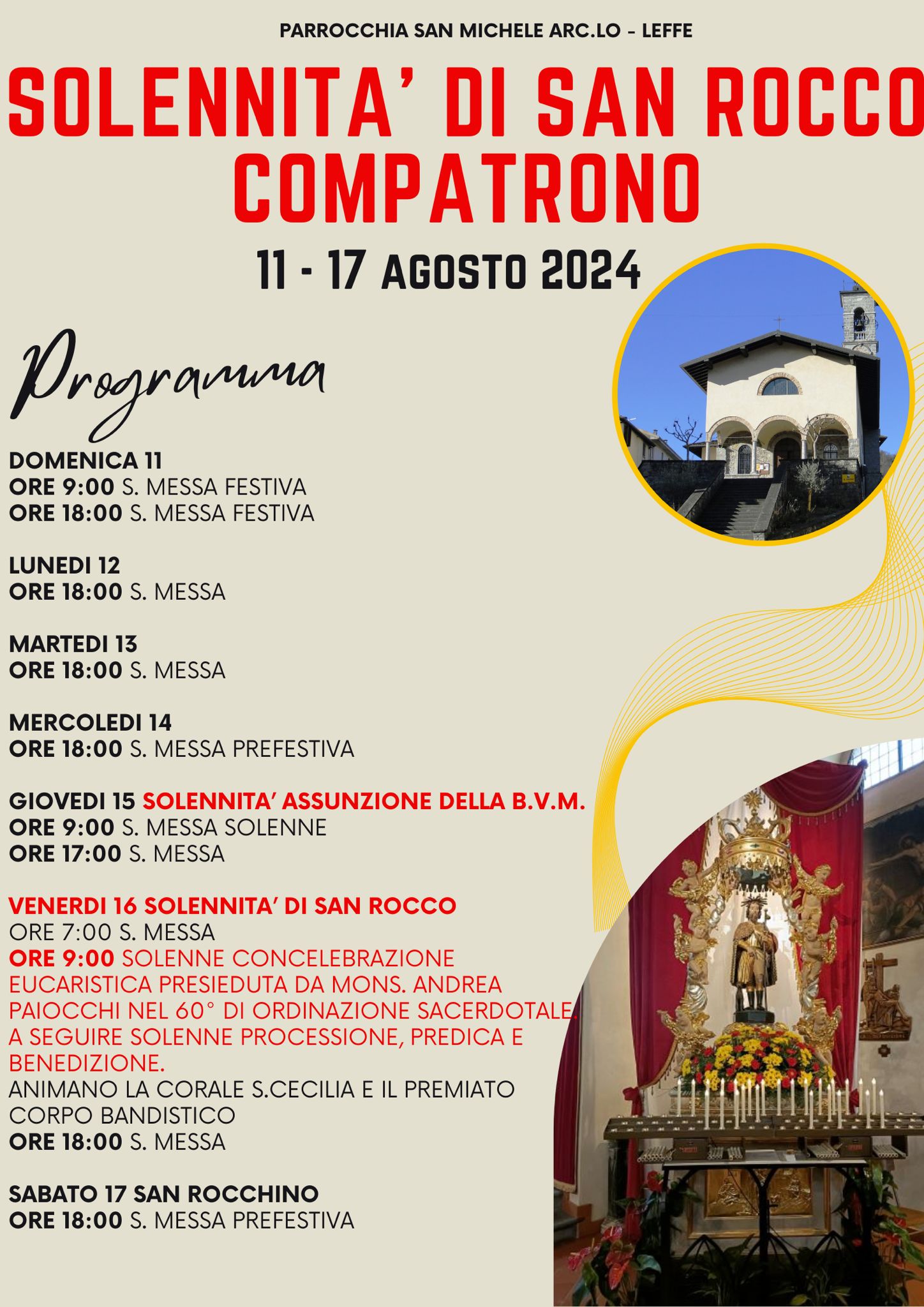 Un appuntamento molto atteso, legato alla devozione popolare e all’epoea dei “Coertì”, gli ambulanti leffesi che rientravano in paesi da ogni angolo d’Italia per celebrare il Santo Pellegrino, loro protettore. Prende il via domenica 11 agosto a Leffe il Settenario dedicato a San Rocco, venerato nella chiesa a monte dell’abitato. Sino a mercoledì 14 viene celebrata la messa alle 18. Giovedì 15 agosto, solennità dell’Assunzione della Beata Vergine Maria, la messa solenne è in programma alle 9 e quella vespertina alle ore 17. Venerdì 16 agosto, solennità di San Rocco, messa alle ore 7 e alle 9 solenne concelebrazione presieduta da mons. Andrea Paiocchi, nel 60° di ordinazione sacerdotale. La messa sarà seguita da processione, predica e benedizione, con accompagnamento della Corale S.Cecilia e del Premiato Corpo Musicale. Messa vespertina alle 18. Sabato 17 agosto, festa di San Rocchino, messa vespertina conclusiva alle 18.