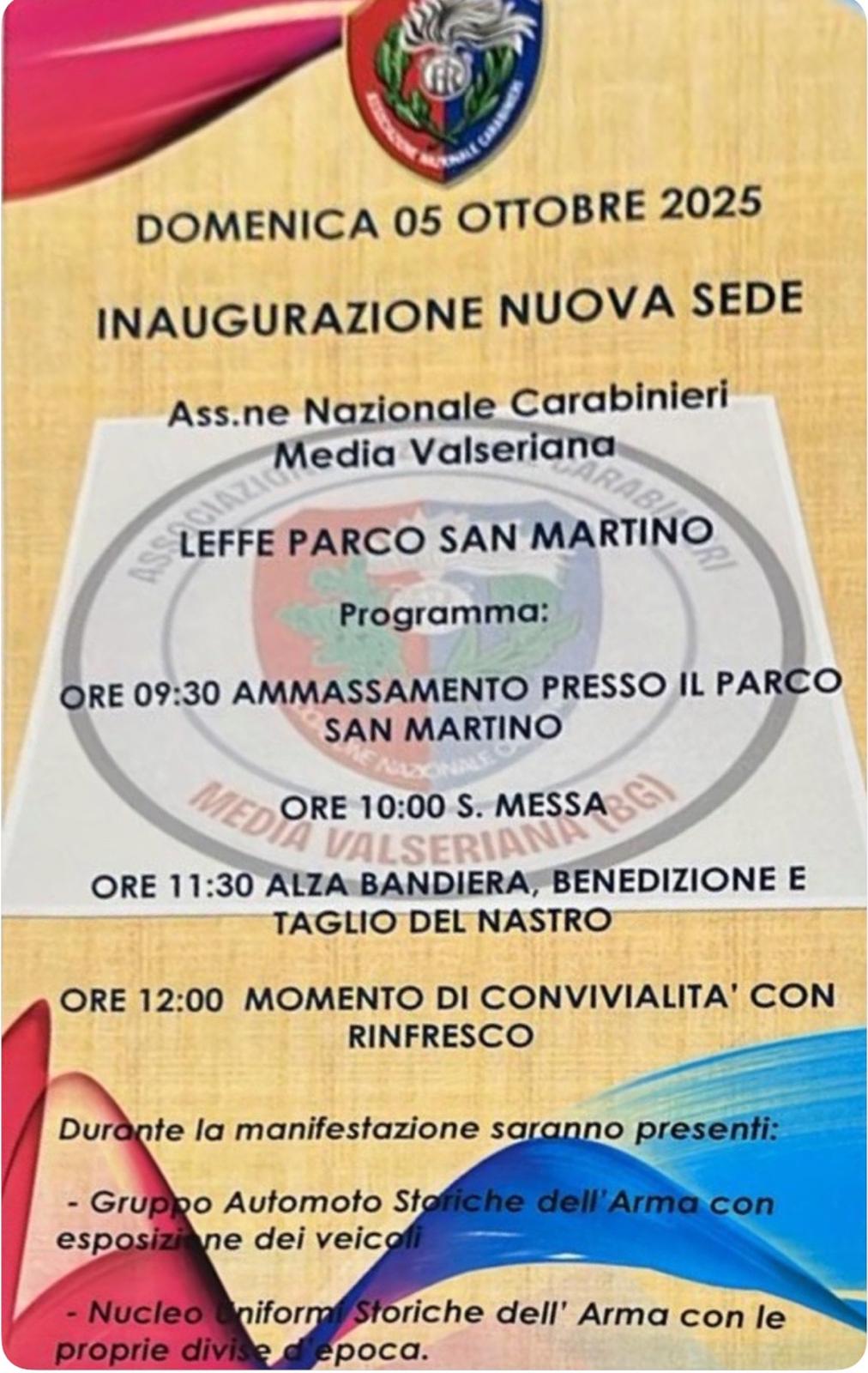 La Sezione Media Valseriana dell’Associazione Nazionale Carabinieri è lieta di invitare la cittadinanza all’inaugurazione della nuova sede presso il Parco San Martino di Leffe.