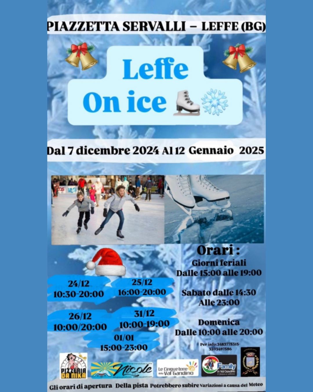 Nel cuore di Leffe, in piazzetta Servalli davanti al Municipio, arriva la pista per il pattinaggio su ghiaccio. Divertimento assicurato per ragazzi e famiglie, aperta tutti i giorni con orario prolungato nei fine settimana.