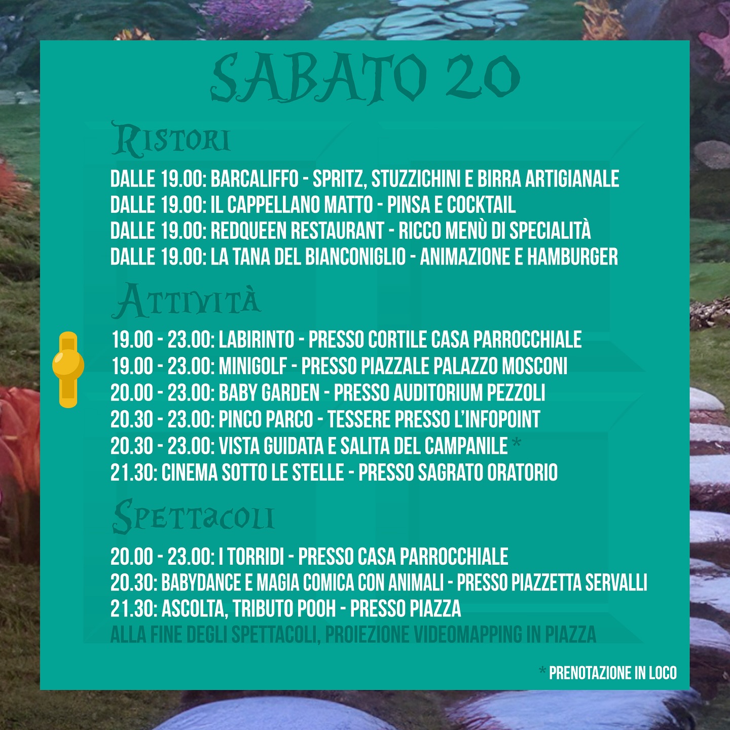Tutte le sere spritz, stuzzichini e birra al BarCaliffo, pinse e cocktail presso il Cappellano Matto, ricco menù al RedQueen Resturant e hamburger alla Tana del Bianconiglio.