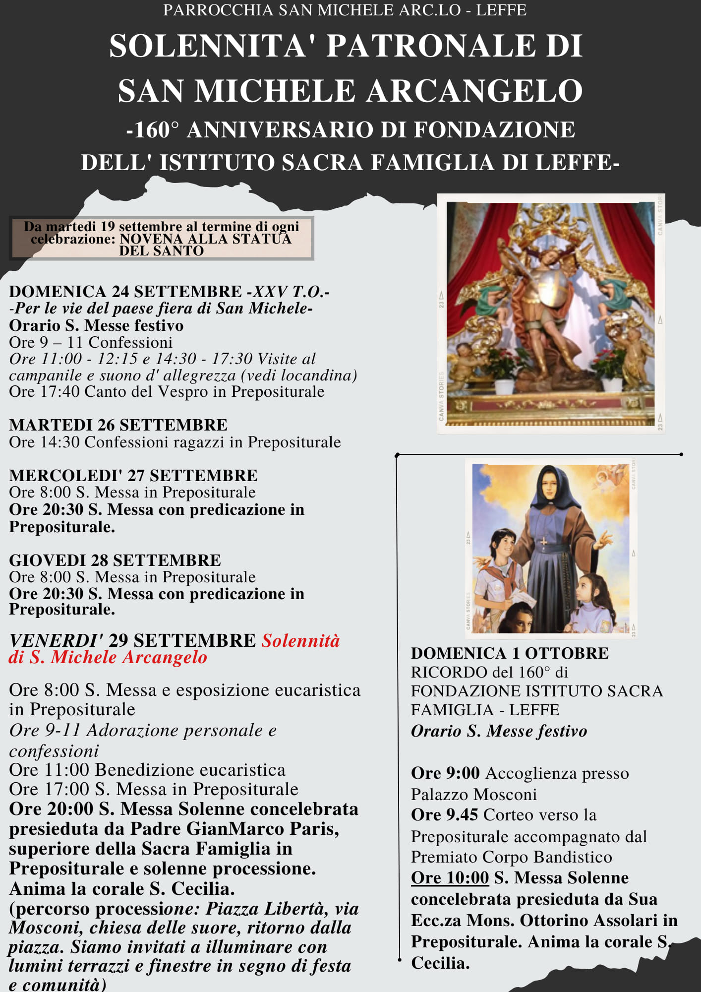 - Venerdì 29 settembre, festa liturgica di San Michele, messe alle 8 e alle 17. Alle 20 messa solenne concelebrata presieduta da Padre Gianmarco Paris, superiore della Sacra Faniglia, animata dalla Corale S.Cecilia e seguita dalla processione lungo le vie illuminate dai lumini.
