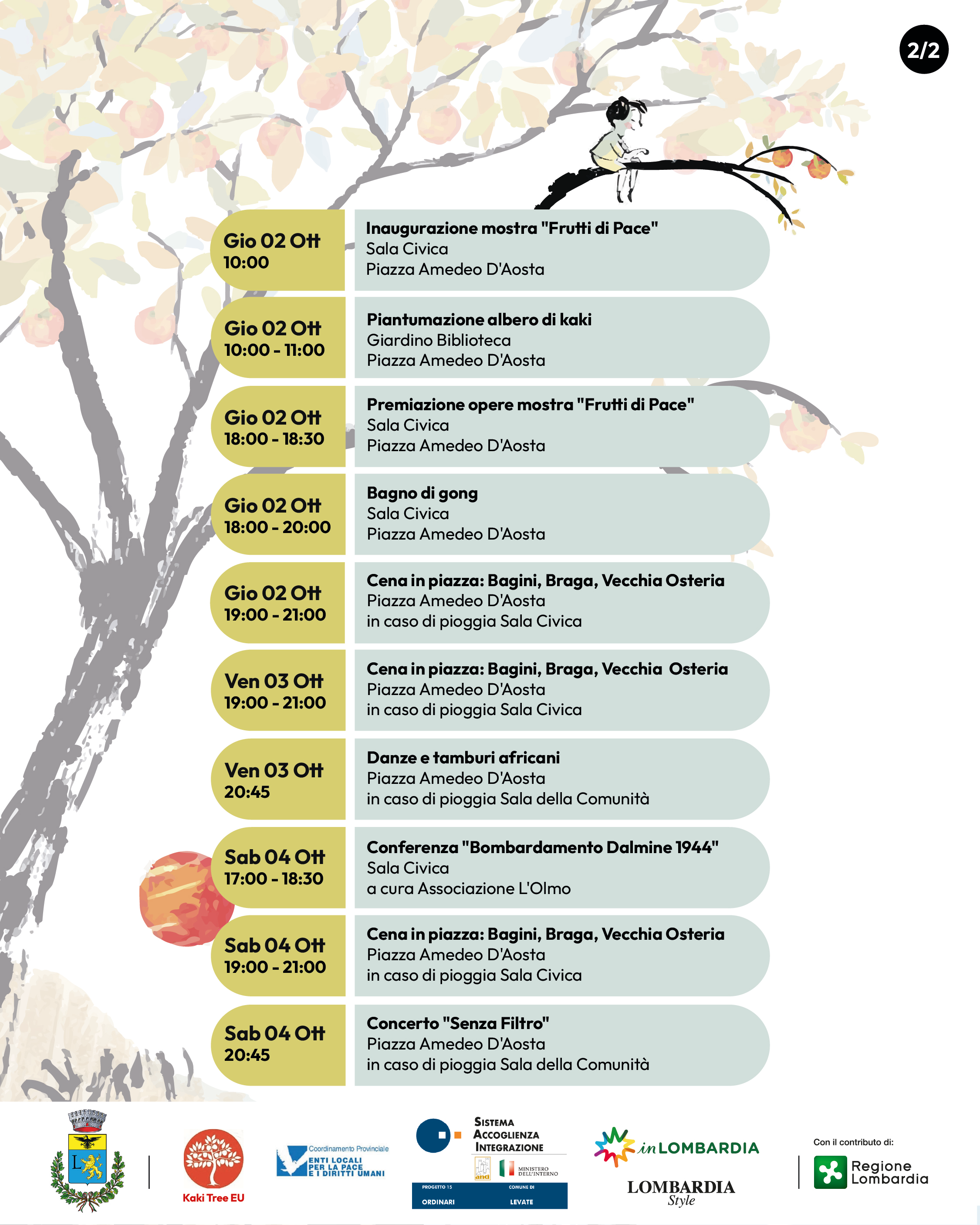 In programma spettacoli teatrali, musicali, cene etniche, giochi, etc ... per arrivare in conclusione il 2 ottobre, giornata internazionale della non violenza, alla piantumazione dell'albero di kaki, figlia della pianta sopravvissuta alla strage di Nagasaki.
