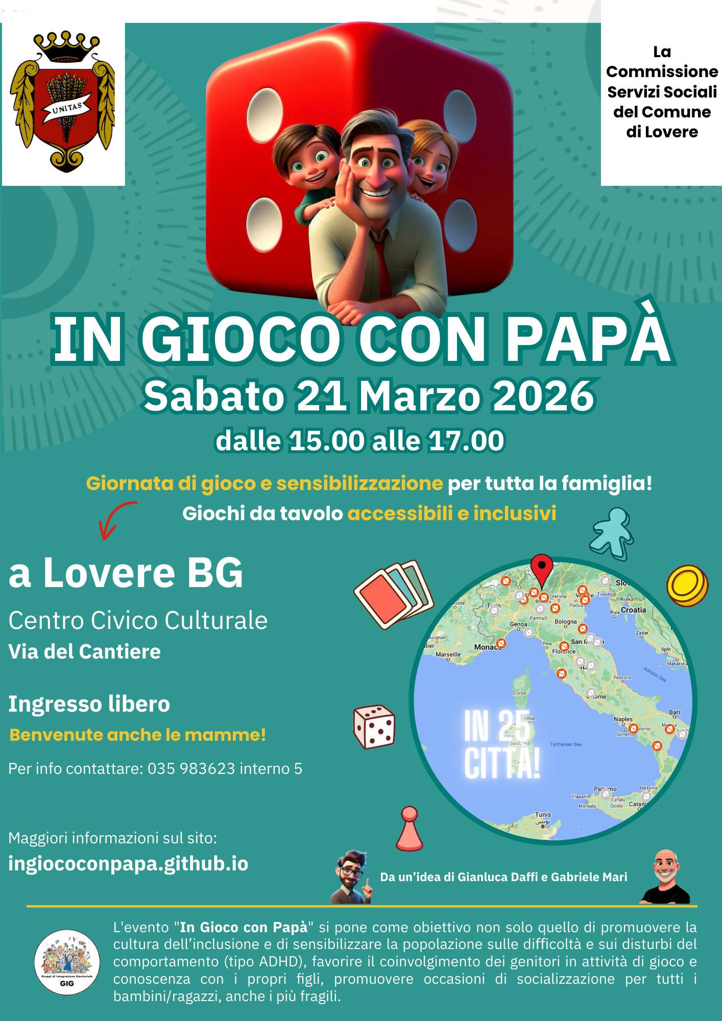 Presso il Centro Civico Culturale al Porto Turistico di Lovere, si terrà la terza edizione di «In gioco con Papà», un evento nazionale dedicato al gioco e all’inclusione.
