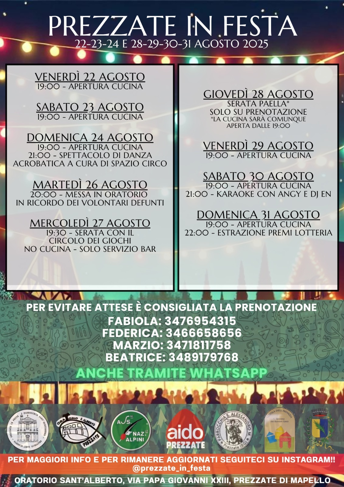 Dal 22 al 31 agosto 2025, l’Oratorio di Prezzate ospita otto serate di festa con cucina tradizionale, spettacoli, musica dal vivo, giochi e momenti di comunità aperti a tutti.