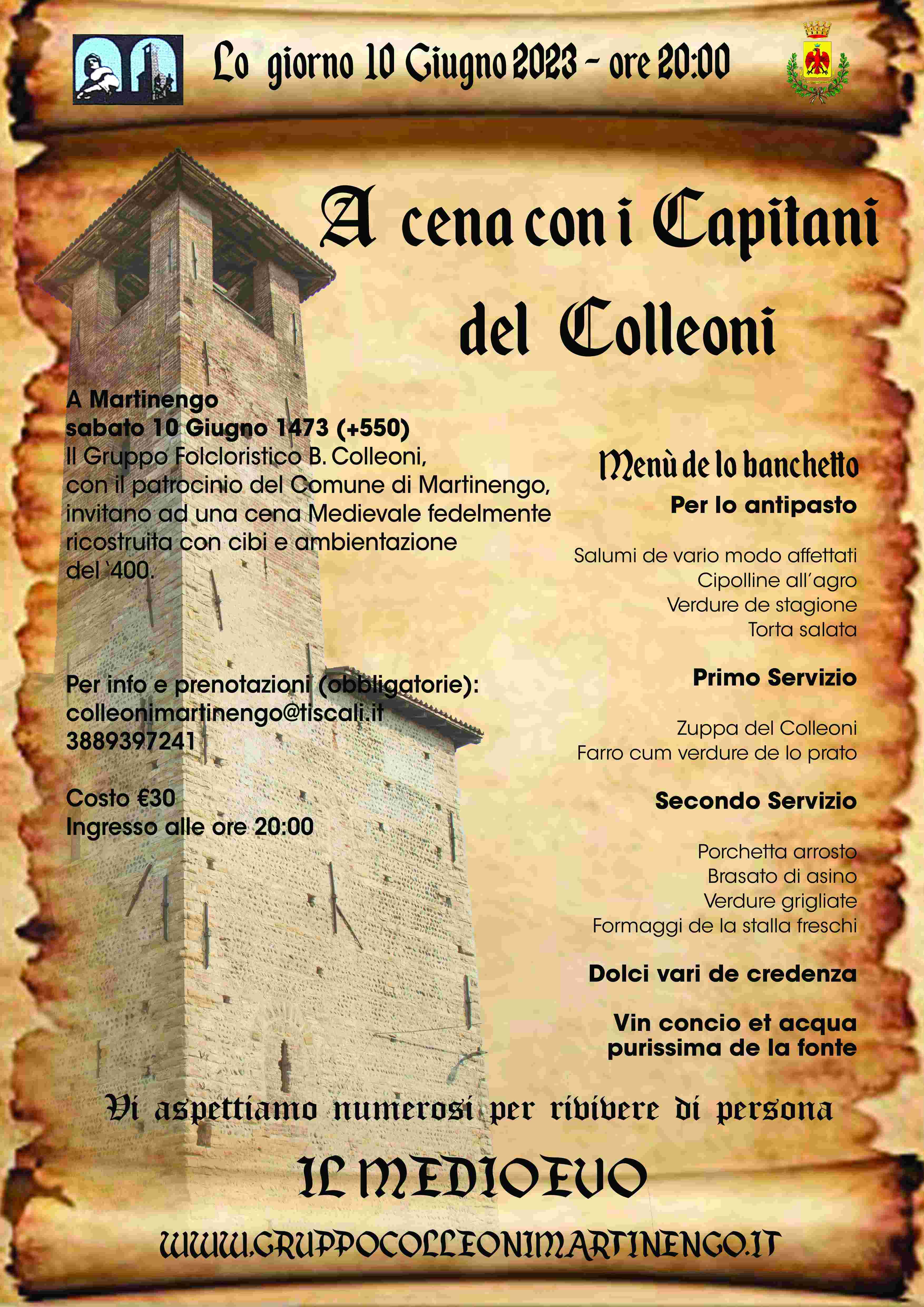 Una "vera cena medievale" alla corte di Bartolomeo Colleoni, organizzata rievocando l'atmosfera del 1400 solo con torce, bracieri e candele, e con l'intrattenimento di giullari / cantastorie.