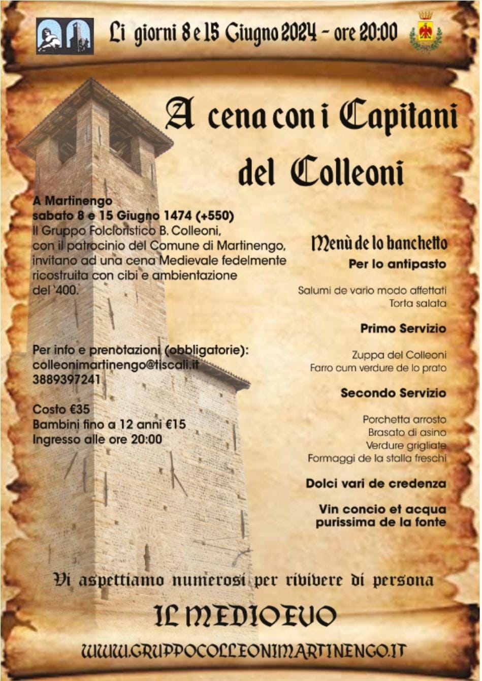 Iscriviti ad una delle nostre due cene medievali in programma il 08 e 15 giugno e tuffati con Bartolomeo Colleoni nel Medioevo!