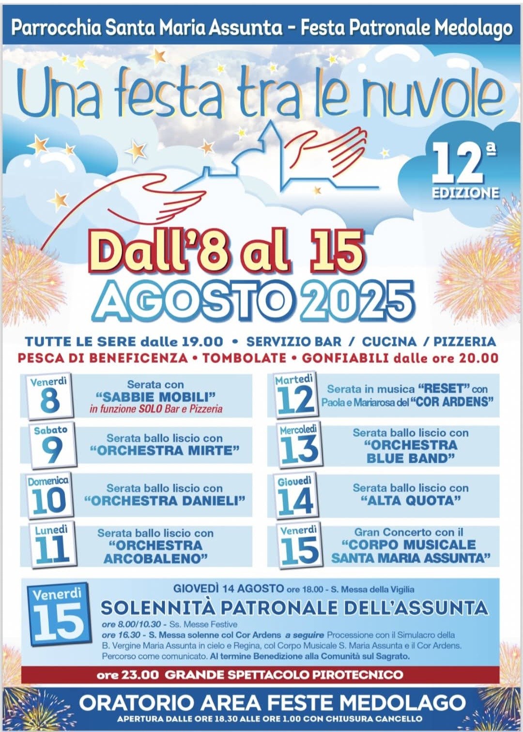La «Festa tra le nuvole» si svolgerà dall'8 al 15 agosto. Ogni sera, a partire dalle 19, sarà attivo un servizio bar, cucina e pizzeria, affiancato da una pesca di beneficenza e dalle tombole. Dalle 20, saranno disponibili anche gonfiabili per bambini.