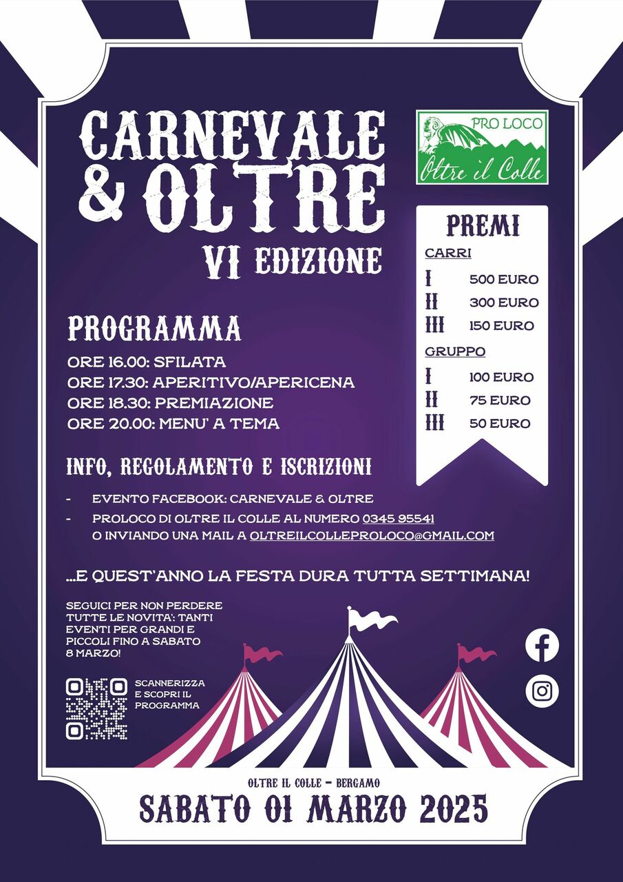 Con grande entusiasmo ecco che torna la VI edizione di Carnevale&Oltre! Grandi premi per carri, ma anche per le singole maschere. Una festa con sfilata, divertimento, un ricco aperitivo e animazione.