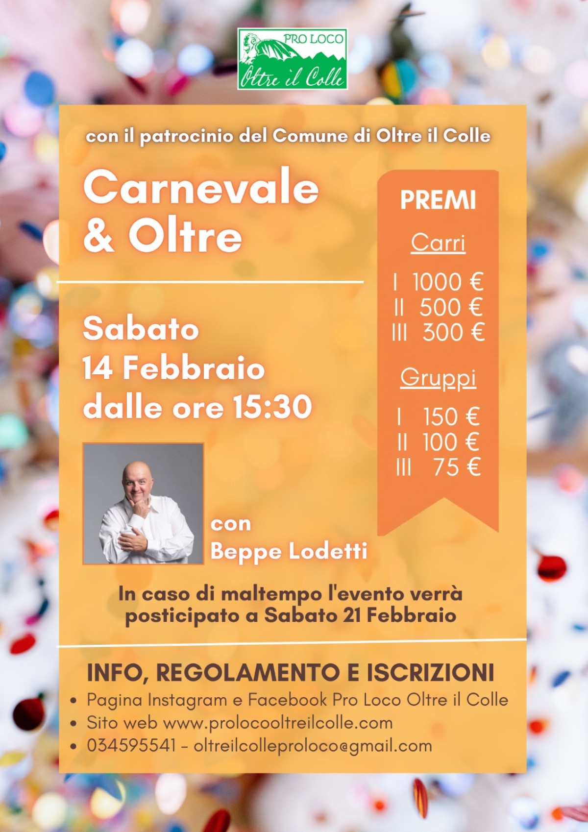 "Carnevale & Oltre" si terrà sabato 14 febbraio a partire dalle 15:30 nel Comune di Oltre il Colle, con il patrocinio dell'amministrazione locale e l'organizzazione della Pro Loco.